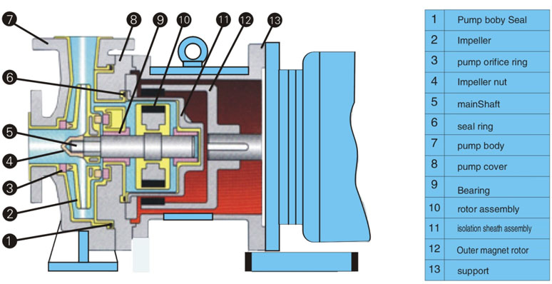 IMD fluoro-plastic magnetic drive pump has no shaft seal, uses magnetic coupling for indirect drive and therefore avoids any leak. The spacer sleeve made of new material has remarkable mechanical propertie...IMD fluoro-plastic magnetic drive pump has no shaft seal, uses magnetic coupling for indirect drive and therefore avoids any leak. The spacer sleeve made of new material has remarkable mechanical properties and avoids magnetic eddy flow that ordinary magnetic pumps have.
