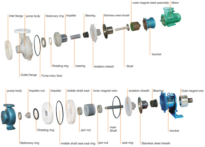 CQB magnetic drive centrifugal pump (CQB magnetic pump). When the outside magnet steel of magnetic drive rotates, the magnetic line of force goes through the gap and spacer sleeve to work on the inside mag...CQB magnetic drive centrifugal pump (CQB magnetic pump). When the outside magnet steel of magnetic drive rotates, the magnetic line of force goes through the gap and spacer sleeve to work on the inside magnet steel driving the pump shaft rotating in step with the motor and transferring torque without contact. The liquid at the drive input end of pump shaft is fully confined inside the spacer sleeve without any dynamic seal, thus avoiding any liquid dripping, leak and spill which is a frequent problem in petrochemical industry. This pump, suitable for conveying toxic, harmful, flammable, explosive and precious liquids, is an ideal pump for factory buildings free from leakage and pollution.