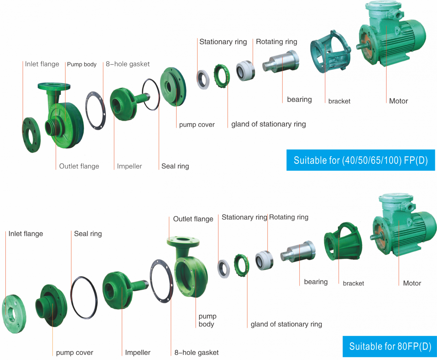 PVDF material: airtight, nontoxic, nonpolar, oxidation resistant, antiaging, good mechanical property, resistant to strong oxidant, halogen, arene solvent, working temperature -40°C~135°C. RPP material: nonpolar, nontoxic, resistant to common acid, alkali and salt (without solid particles), working temperature -12°C~100°C. 80FP-32 (100FP-32) pump is the best auxiliary pump for the RPP -54(RPP-65) water jet vacuum pump.