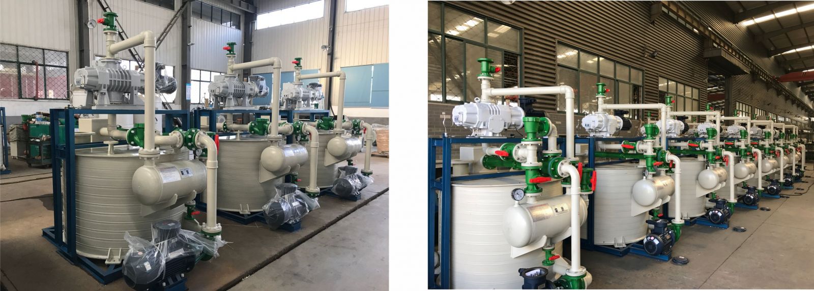 Full-plastic horizontal water jet vacuum unit set as backing pump to pump caustic gas. The ultimate vacuum of single-stage roots pump is 150Pa, of two-stage roots pump is 25Pa and of three-stage roots pump is 1 Pa.